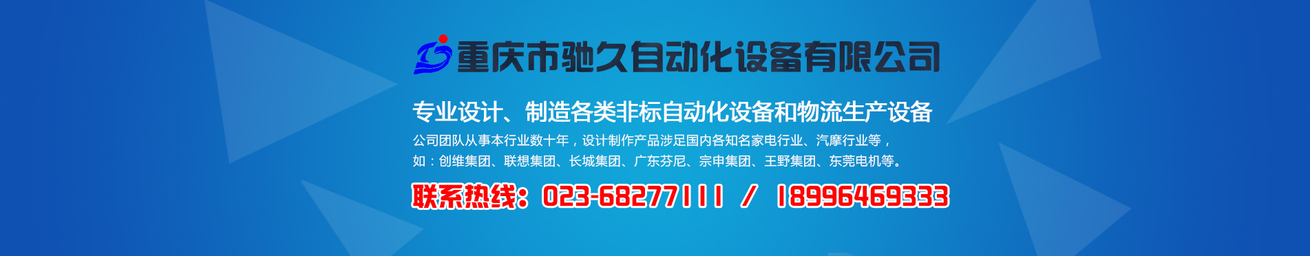 重慶市馳久自動化設備有限公司是一家專業設計、制造各類非標自動化設備和物流生產設備的綜合性企業。 公司以“馳而不息,久而彌篤”為發展理念,堅持“憑誠信獲市場,靠質量得效益”的企業宗旨,不斷創新理念,持續發展技術,為客戶提供滿意的自動化物流系統解決方案和非標自動化設備。 公司生產基地坐落在重慶市北碚區歇馬鎮天馬村,占地面積約5000平方米。公司擁有先進的加工設備,配套激光切割機、數控剪板機和折彎機等;同時擁有自動涂裝生產線。 公司團隊從事本行業數十年,設計制作產品涉足國內各知名家電行業、汽摩行業等,如:創維集團、聯想集團、長城集團、廣東芬尼、宗申集團、王野集團、東莞電機等。 [ 了解更多 ]